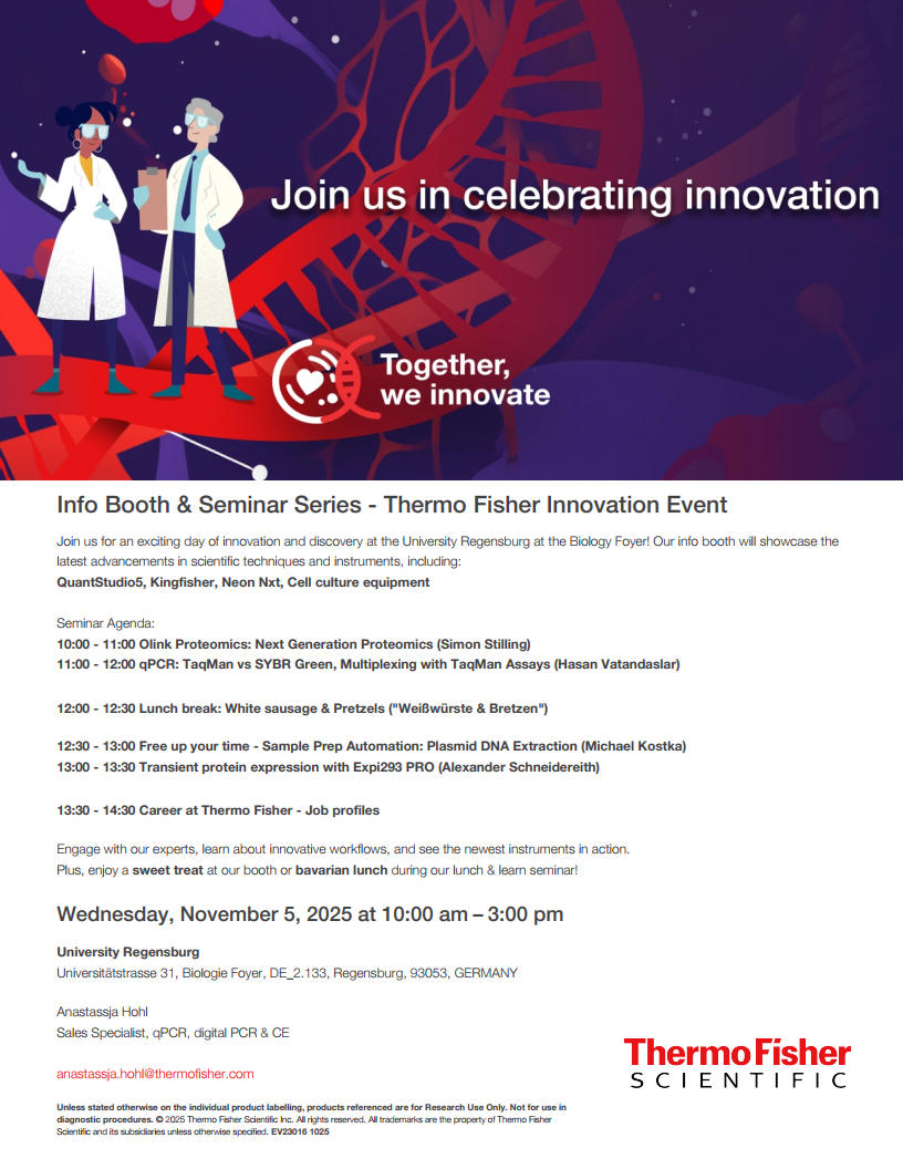 Join us for an exciting day of innovation and discovery at the University Regensburg at the Biology Foyer! Our info booth will showcase the latest advancements in scientific techniques and instruments, including: QuantStudio5, Kingfisher, Neon Nxt, Cell culture equipment