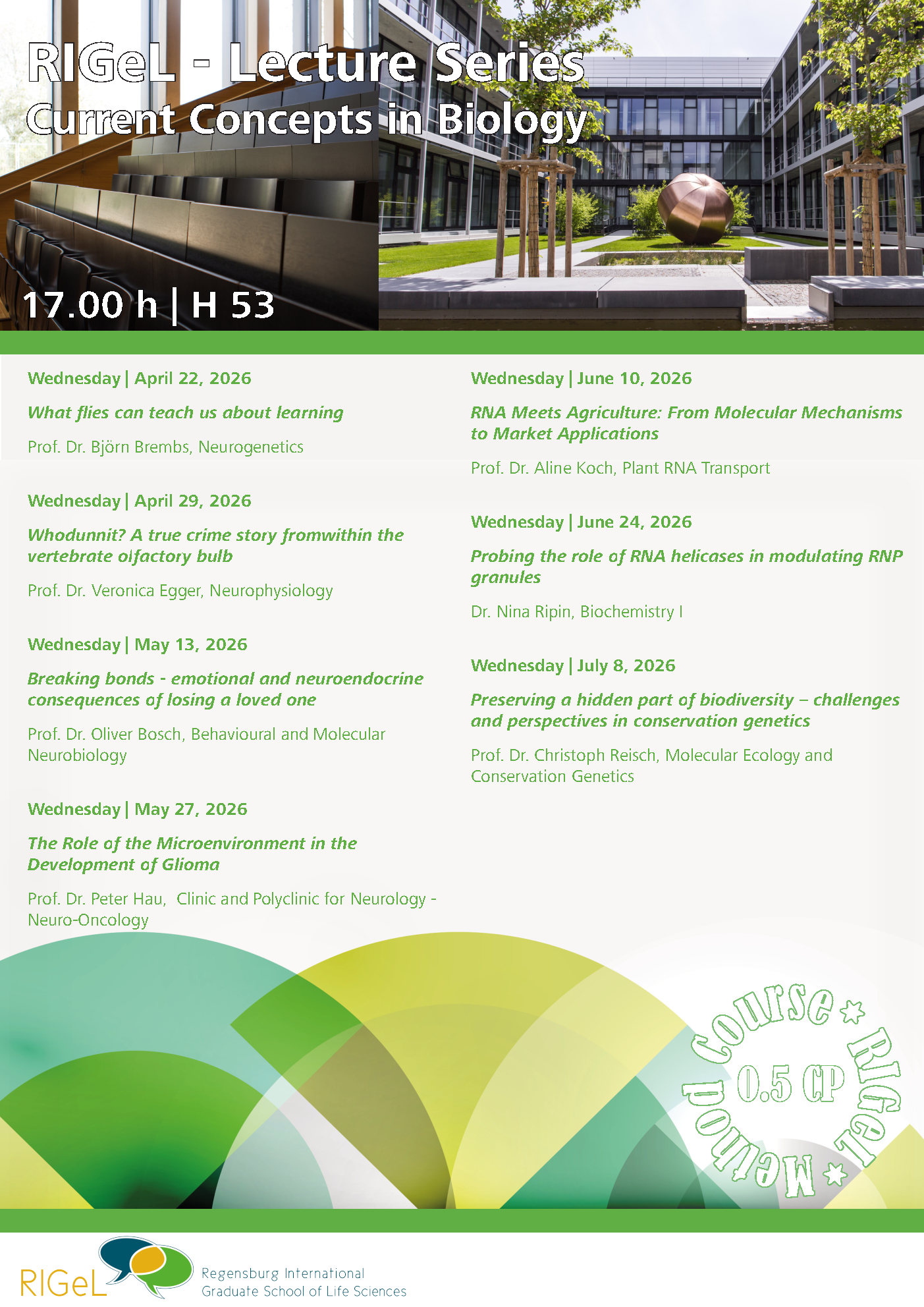 With this lecture series we would like to give you an overview about the current research topics of the working groups of the faculties Biology and Preclinical Medicine and Medicine as well as state-of-the-art methods which are used in the different groups.